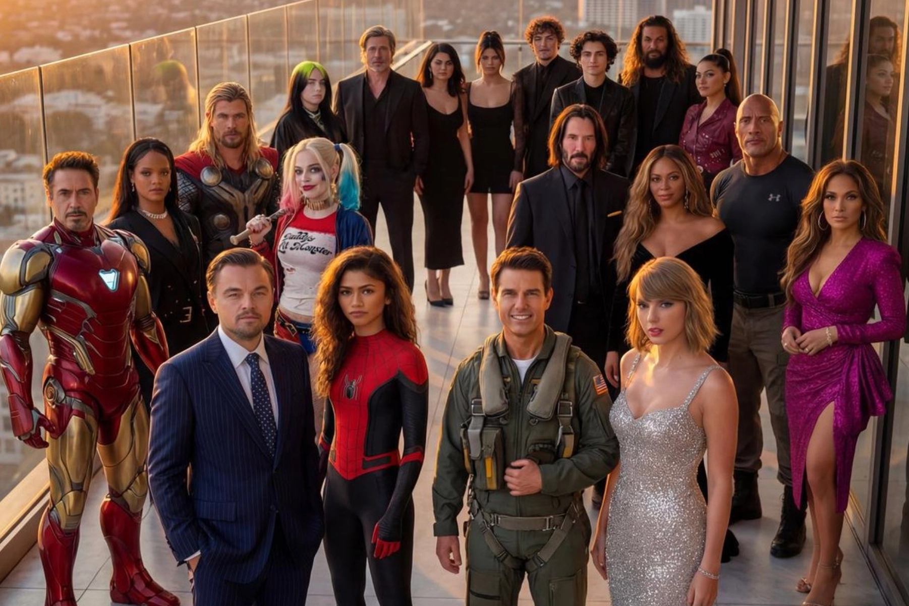 Create a hyper-realistic, ultra-sharp, full-color large-format image featuring a massive group of celebrities from different eras, all standing together in a single wide cinematic frame. The image must look like a perfectly photographed editorial cover with impeccable lighting, lifelike skin texture, micro-details of hair, pores, reflections, and fabric fibers.GENERAL STYLE & MOOD