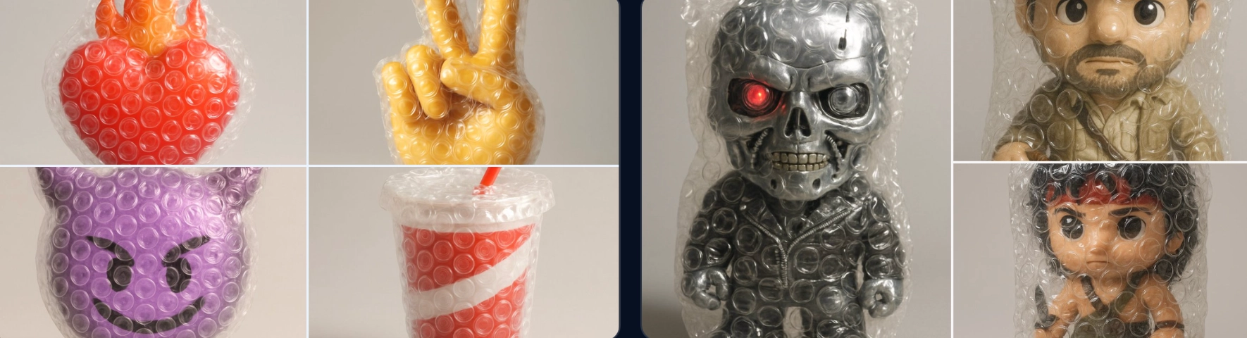 ], entirely wrapped in transparent bubble wrap. The plastic is tightly fitted, with clearly visible air-filled bubbles creating overlaid reflections and soft distortions of the emoji underneath. The wrap has a glossy, crinkled texture that catches the light in detailed highlights. Set against a soft, neutral grey background with subtle shadows. Studio lighting should emphasize the tactile quality of the bubble wrap and the surreal effect it creates. Whimsical, satisfying, and visually clean. 출처(Anima_labs)