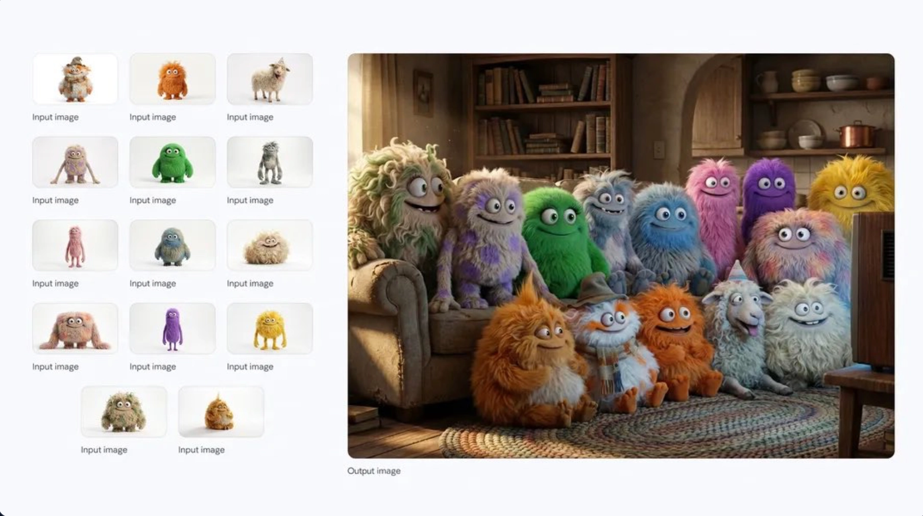 다중 이미지 입력: 최대 14장의 레퍼런스 이미지를 입력하여 하나의 새로운 콘텐츠로 결합할 수 있습니다. (예: 제품 + 로고 + 배경 + 모델 사진 조합)